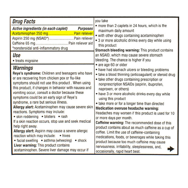 • Contains a combination of acetaminophen, aspirin, and caffeine